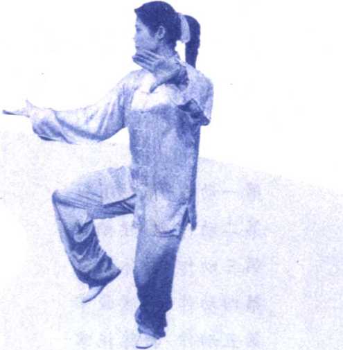 ⑧重心前移,上体左转,右腿屈膝向前提收;右掌向下划弧, 经体侧前举托于右膝上方,掌心向上,左掌左摆横于体侧,掌心 向外指尖斜向上;目视右掌。(图149、150、151)
