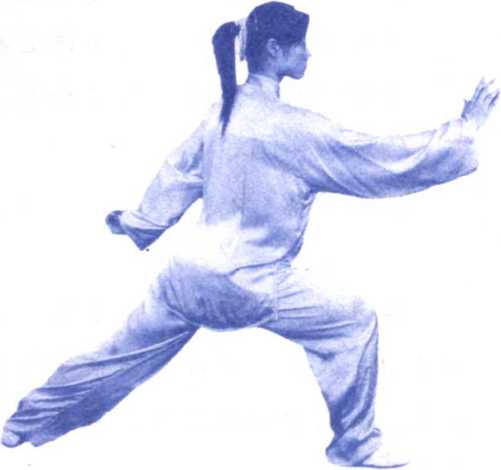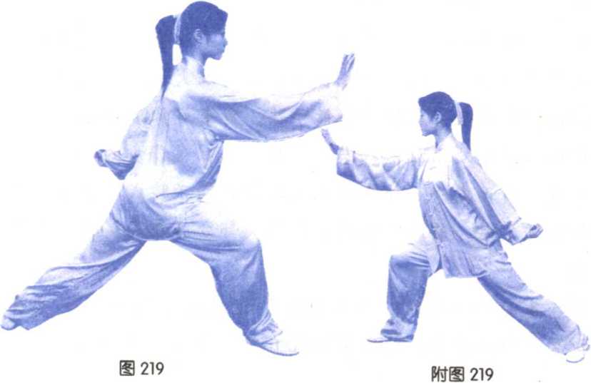 ①重心右移,上体右转, 右脚尖外展,左脚尖内扣,右 腿屈弓,左腿自然蹬直;右掌 向上挑至体前,成侧立掌,腕 高与肩平,左臂内旋下落至身 后,勾尖向上;目视右掌。 (图 218、219 附图 219)