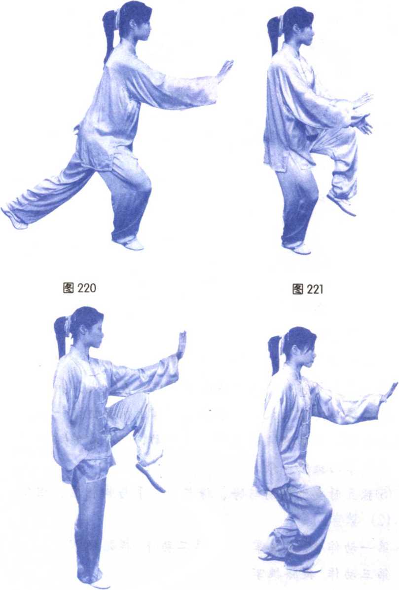 前、向上挑起,成侧立掌,指尖高与眉齐,右掌翻转下按于右胯 旁;目视左掌。(图220、221、222)