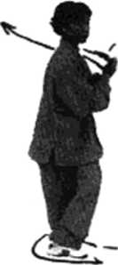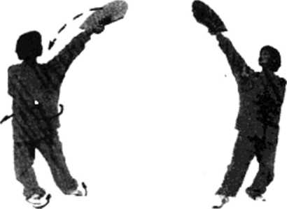 图186 (反面)图186 (反面)右手持扇上提向左向上再向右斜上方划右手持扇上提向左向上再向右斜上方划弧展崩,左手立掌于右肩前。眼看扇面(图186)。