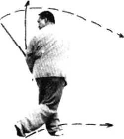 右脚向前摆步重心前移,右转腰