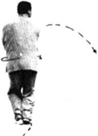 左脚掌斜摆下落,腰向左转,重 心落左腿,剑尖自上向下向左在体侧 划竖面圆后挑;同时剑指按右腕落至? 左腰侧。眼随之望后(图7)。