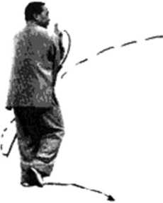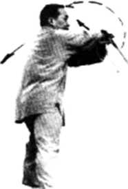右手内旋仰腕持剑向后向右再向 前云转,上体略向后仰,左手向左外 侧伸展°眼看右前方(图15).