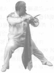 接上式。左侧遇敌攻我,我便进身扫刀而应之,能避则避, 能攻则攻,决不勉强。其方法都是随敌人的进攻劲势来安排,对 方如要继续前进,我则能迅速化解,而且劲势要能够稍微大于对 方。但是化解并非完全被动挨打,或是消极防御;相反,在化解 的过程中,可做好一切准备,并且能储蓄劲力,随时能够进攻。 因此右转腰120。,刀随腰扫至右侧,右腿一足立地,独立支撑全 身。稍微屈膝,五趾抓地,重心完全移置右腿。这时候前后相逢, 对方使用极为精锐的招数,前后夹击于我。在这紧急关头,我则 全身蕴蓄,起腿长身,将左腿蹬出,劲力贯于脚跟,全身舒展,身