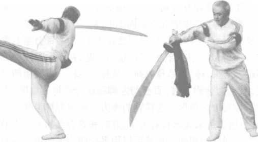 接上式。刀刃向外截住对方之枪郛下端,连续前进三步,趁 对方不备,猛然起右腿往上蹬踹刀背,顺势翻腕拧刀前刺。蹬踹 的优势在于:一则有崩,二则能弹,使对方难以应付,无可奈何,