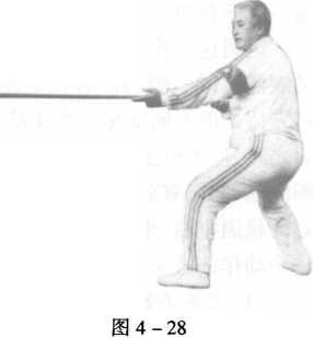 前扎,紧背空胸下坐腰,两腿屈 膝脚跟稳;任凭他人来击打,左 来左跨,右来右闪;前后进退将 敌拦,上下旋转任你使;直来直 去巧安排,乘机得势逃脱难;粘 黏连随妙开合,引进落空合即 发;人退我追不舍他,任他巨力 来攻我;直中求圆亦可拿,两手 握竿不放松;敌人逼进来取我, 牵动四两破千斤(图4-28)。