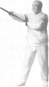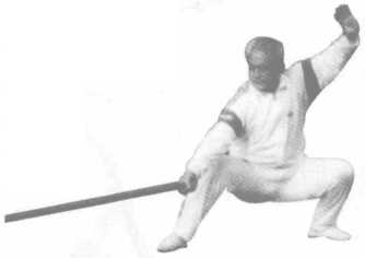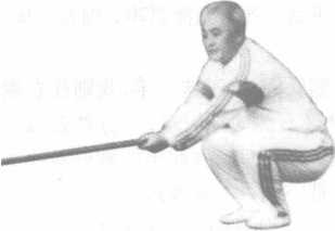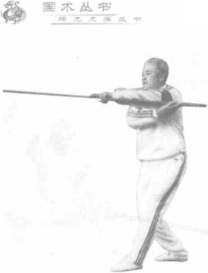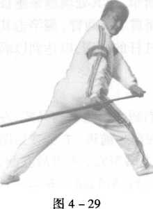 由于单手执竿威力不够,于是我再进并左腿,竿随身动,左 臂从上而下捧住竿端,随坐腰一呼即打,劲足但要留有余地,不 可“涸泽而渔”。左手在前右扫竿,右手在后左掖竿(图4 - 31)。