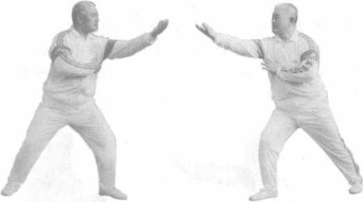 上动不停,左腿后撤四分之一步,重心置于左腿,右腿随着 后退四分之一步。下坐式,劲力由尾骨至腰脊向上顶劲,由肩至 颈部又向下缩劲,腰与丹田内含住劲。身体的下部成为前腿虚, 后腿实的形式。左肩下塌,虚腋撑肘,手腕微微上仰,小指根上 翘,大拇指指向胸部,整个胳膊成为圆形,左掌随腿同时由下丹 田上移至胸前。右臂塌肩垂肘,由翻背掌向里扣腕,旋转成掌心 朝下。大拇指向内裹劲,食指、中指、无名指和小指指梢均已成 钩、擒、抓之形,随着颈部极力缩劲。左脚跟与臀部、后背及后脑 部上下一条直线,不偏不歪,直立稳固牢靠。周身放松,劲力内 含,松而不懈,紧而不僵。起落虚实阴阳不离,手、眼、身、法、步 须互应,互相陪衬,关系密切,上下四肢协调一致,劲力虚实互相 配合(图1 -13)0