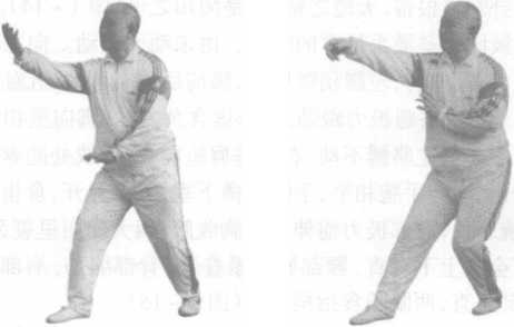 上动不停,进右腿向前迈出一步,右腿屈膝,重心偏于右腿 成为半弓步。进右腿的同时左手下垂回收,翻手腕,掌心朝里护 胸。右臂沉肩由胸前向上翻揉弹出,须沉腕,五指似并非并,掌 心朝里,劲力由腰贯至背到臂通过掌背弹出。眼从右手中指处 前视,周身放松。左臂极力缩劲,右臂极力前伸,但不可僵。上下 相连,内外一气贯通。所谓“弹掌”,弹就是如同弹簧、绷簧、橡胶 等,弹性强,伸缩性强。利用弹的特性将对方弹击出去。弹也可 称作发射、弹射,那就是绷、点、弹、裹、旋、缠,劲力充沛,虚实分 明(图 1 -ll)o