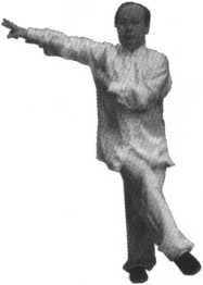 前上方戳击出去;同时,上步成右弓 步;左手沿着向前伸出的右臂回带,置 于右肩头内侧,掌心向外,拇指在下, 其余四指在上,目视右手二指。