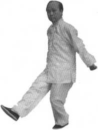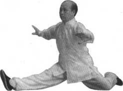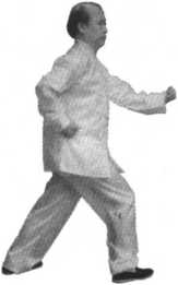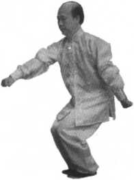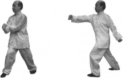 右臂略有弯曲,上身正直,含胸拔 背。拳的高度与人的裆、小腹部位持 平。