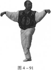 双掌向身体左、右分拨至与双 臂同平后;抬左脚,脚面绷直,护住 裆部,右脚独立;与此同时,头向左 转,目视左手勾手,右手勾手置于身 体右后侧(图4-91)。