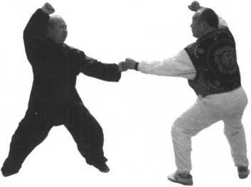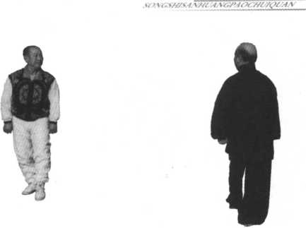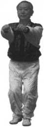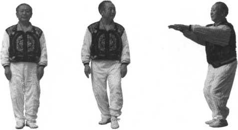 国术丛爷豕Wd丛书左脚向前迈出一大步,随之上身提起,身体重心前移,右脚 跟进,并向左脚;同时,双手手掌由身体两侧一起向前撩击而 出,双手拧腕,掌心朝下,双拳与肩的高度持平,