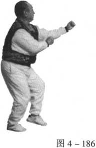 左扭转90。,右脚并靠向 &脚;心笮向身体前轮 砸,双拳拳眼相对;然〔, 謂/n鄕重心置于 細之上;同时,右拳回 輕左耗擔下方,抱 拳蓄势(图4-186)。