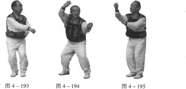 与此同时,上身下坐,重心置于双腿之上,左手掌向前冲打,随身体上身向左转90°,右脚跟进,并向左脚,右拳向身体 前横击,与左拳变掌后合拍击打,左手置于右手臂内侧肘部,目 视右拳(图4-195)。