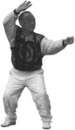 地,右脚跟进,同左脚并齐;同 时,左掌向体前撞击出去,右 掌横架于头顶右前侧上方,上 身下坐,重心置于双腿之上,图4_2〇2 成坐虎势,目视左掌(图4 - 203)。