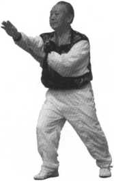 与此同时,上身下坐,重心置于双腿之上,左手掌向前冲打,