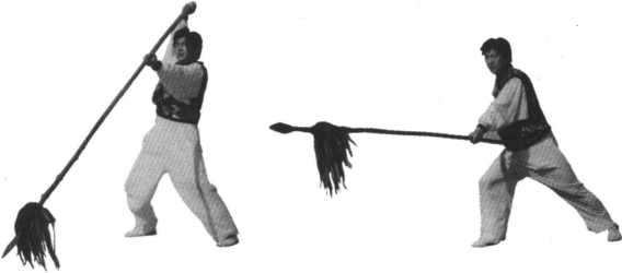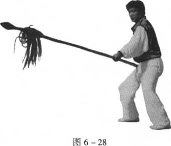 跟右步,双脚站成马步;?6_26 双手握枪同时向下砸枪,目视枪尖 (图 6-28)。
