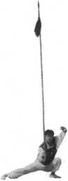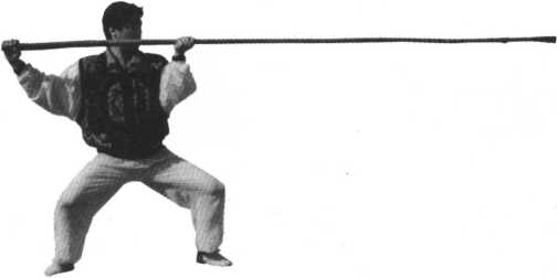图 6-27上动不停,左脚落 地,与右脚站成马步;双 手握枪同时下劈枪,目 视枪尖(图6 - 27)。