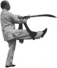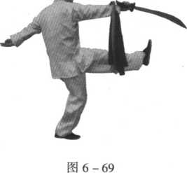左脚落地,左手抓住握刀的右手腕,右手刀抬起从身体右 后侧由上往下、再往上紧贴右腿撩击出去,刀刃朝上;同时,抬 右腿,脚面绷直,紧随刀撩击的方向踢出,待右脚落地后,向上 撩击的右手刀回收紧贴身体左外侧,由上往下、再往上撩击;同 时,抬左腿,脚面绷直,紧随刀撩击的方向踢出,目视刀撩、脚踢 的方向(图6-68、图6-69)。