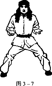 两掌从体前回收至胸侧,内旋 翻掌后,变成虎爪掌,猛力向下按 至两跨外侧,虎口向里,目视前方 (图3-9)。