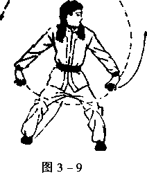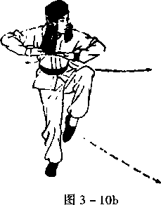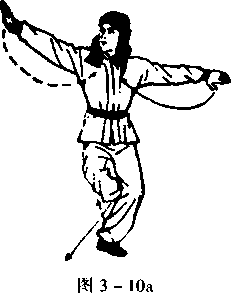 右臂伸直,右手变成“八字 掌”,从右跨外侧经体前向下、向上 抡臂于体前右侧,与肩同高;左臂 伸直,左手变成“八字掌”,由体左 跨侧上抬,与肩同高,两掌心均向外;同时,提右脚,以脚里侧踢 左臀部,目随左手转视(图3 - 10a)。