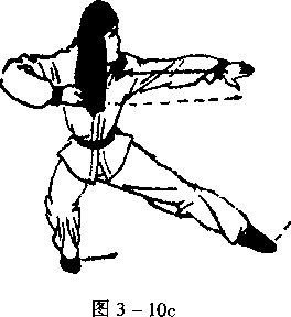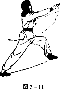 抬左脚,左冲半步,右脚带步呈左弓步;同时,右掌由胸前用 力向前平插,掌心向上;同时,向左转身90°,左掌由体前屈肘回 磕右臂根,手指向上,手心向右臂,目视前方(图3 - 11)。