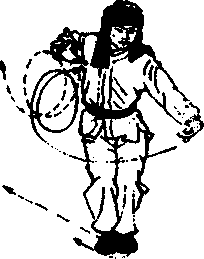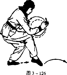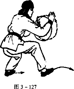 右脚向前迈出大半步,带托左脚,成圈裆步;同时,两掌在胸 前逆时针方向轮转一周,目视右掌(图3 - 127)。