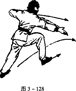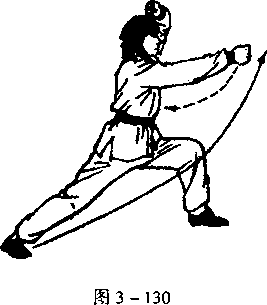左弓步不动,左掌变拳,向上翻至 图3-129