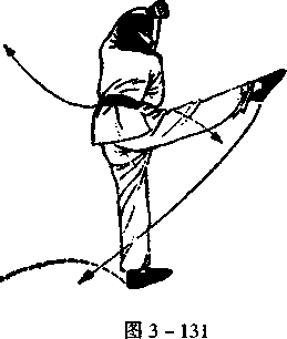 左拳不动,右拳收至腹前;同时,右脚向前踢出,脚面绷平, 目视右前方(图3-131)。