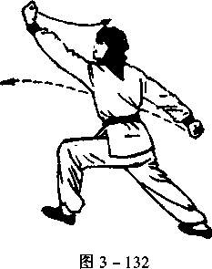 上动不停,右脚向后落半步, 向右转体180°,左脚再向后撤一 步,左转体270°,成左弓步;同时, 左拳收至胸前,向左上方冲拳,拳 面向上;右拳甩向右后方,拳眼向 下,目视左拳(图3-132)。