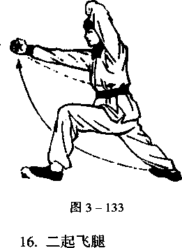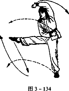 左拳不动,右拳收至左腹前,拳心向里;同时,右脚向前踢 出,脚面绷平,目视右前方(图3 - 134)。