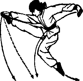 上动不停,右脚向前落地,左脚向前踢出未落地时,利用右 脚的弹力,将右脚腾空前踢;