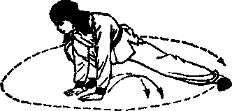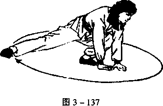 17.前扫堂腿 上动不停,双脚落地,左 腿仆地;同时,双手下落于腹 前按地,并以右脚掌为轴;左 腿向外扫转一周,目视前下方 图3-135