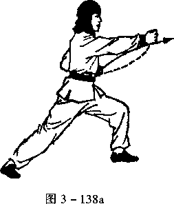 呈前势起身,右脚 向左跳一步,向左转体 90°,左脚再向前迈一步, 成左弓步,左拳抱于左 肋间,拳心向上,目视右 拳(图 3-138a)。