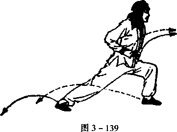 后撤一步;同时,向 右后稍转体,_随之右 脚由左脚后撤一步, 呈左弓步;同时,两 拳变掌,由胸前冲 出,掌心向前,指尖 向上,目视双掌(图 3 - 140) 〇