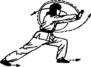 按于左腹面上,以左脚 掌为轴,右腿向后扫腿 一周,目视左前方(图 3-137)。