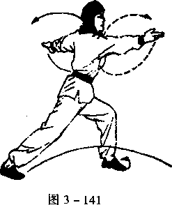 双掌直臂向上、向右在身前 抡臂一周,右掌向右前方顺肩穿 出,掌心向上;左掌向左后方顺肩 穿出,稍低,掌心向下;同时,左脚 向左前方迈出半步,带步拖右脚, 成左弓步,上体左转45°,目视右 掌(图 3-141)。