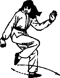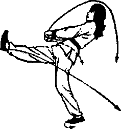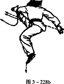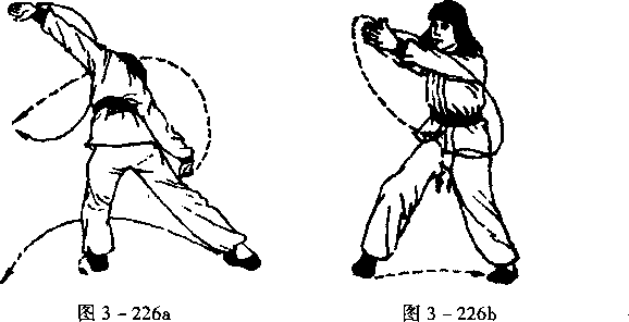 上动不停,左转体270°,左脚提起未 落地时,右脚向右上方腾空踢出;左手摆 向右上方击拍右脚内侧,右手向下摆至右后方,目视左手(图 3 - 228b)〇
