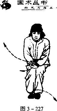 右脚收并左脚,屈膝下蹲;同时,两手 各向外半周至腹前,左掌掌心向上,右掌 变拳,拳心向上,砸击左掌心,目视前下方 (图 3 -227)。