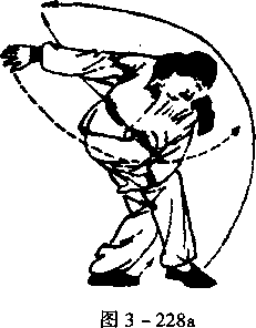 右脚向左半步,身向左前倾;右拳变 掌,两掌同时向右扬起(图3-228a)。