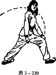 上动不停,右脚不落地向左转体180°,右脚落地时成右弓 步;右手同时经头上向前摆至右体侧,拳心向后;左手同时由胸 前向前崩拳,拳心向后,目视前方(图3 -230)。