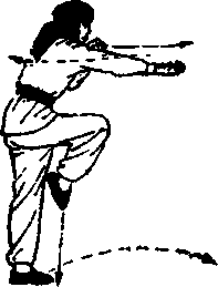 左脚向前一步屈膝,右腿提起;两 拳变掌,左掌屈肘前跳,虎口向里;右 掌摆至右后方,掌心向下,目视右下方