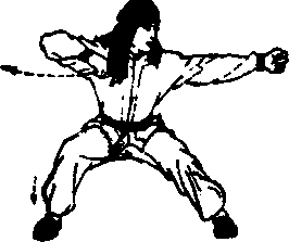 下肢不动,右拳从右胸前向右水平冲出,拳心向下;左拳内