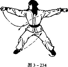旋,拳心向下;同时,向左甩头,目视右拳(图3 -234)。