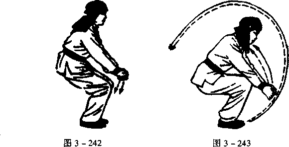 呈前势,蹲势不动,右拳变掌,双掌下抱两膝前,掌心向里, 目视前下方(图3 -243)。