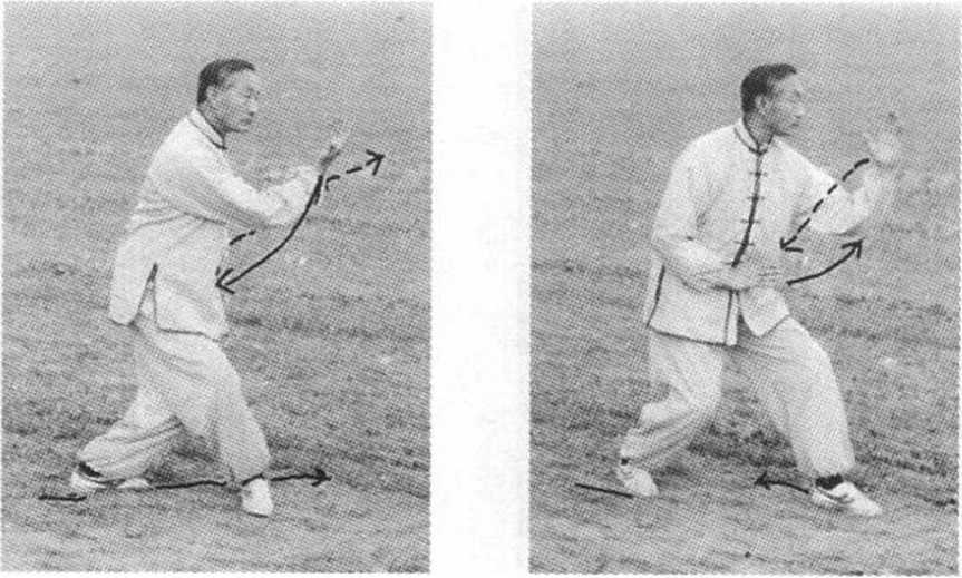 (1) 右脚向前垫步,脚尖向外摆约45。,膝部略屈,重心 向前移至右腿;同时,身向右扭,含胸收腹,右拳变掌随身扭 回抽外旋,掌心斜向上经胸前向前上方转伸,小指翻转向上, 路线呈螺旋形,指与口平(图5-18)o(2) 上式不停,左脚尖微翘,稍提离地面,膝微屈,经右 踝关节处向前上一步,右脚随即跟进半步;同时,左拳变掌外 旋,经胸前向前上方伸出,并与右手背交叉,立掌向前下方劈 出,掌根高与胸平,肘微屈下垂与前膝相合,力达掌外缘;同 时,右掌内旋抽回停于脐前,目视前方(图5-19)。说明:此动作与“2.上步右劈拳”相同,只是方向相异。