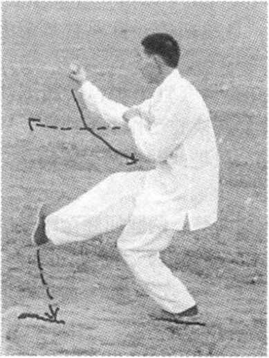说明:右腿上提,要与两拳在胸前的旋转相结合;同时, 在右拳经腹胸部上钻时要收腹含胸,下须稍上提,全身放松; 右脚向下横落,膝微屈成歇步,要与两掌前伸后撤一致,身稍 前俯,腹部收回,重心偏后腿。此形主要练身法的变化。