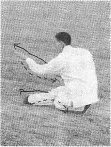 (2) 上式不停,在身向左转至不能再转时,身向右扭转 180°,左脚随体转向右内扣,两腿随之起立,膝微屈,右脚掌虚