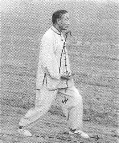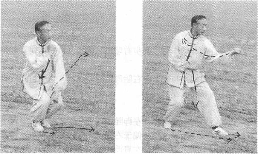 说明:两拳上抬与下插要贴近身前,同时与右脚上步、下 蹲、缩身相配合,在下蹲时上身要挺直,并要收臀;左脚进步 时,左臂外旋挑拨,右臂内旋按捋,与身体伸展和拧腰、裹胯 保持一致,以身体带动前臂,左右保持平衡。这是蛇形的一种 练法,用拳用掌均可,在演练时要表现蛇之伸曲之妙,行走拨 草之能,盘旋灵活之巧,发劲要注意腰臂之配合。其劲属阴, 并带有横意。
